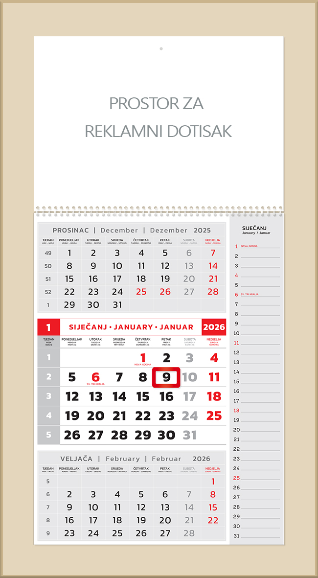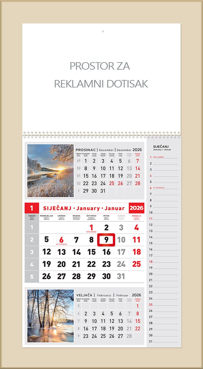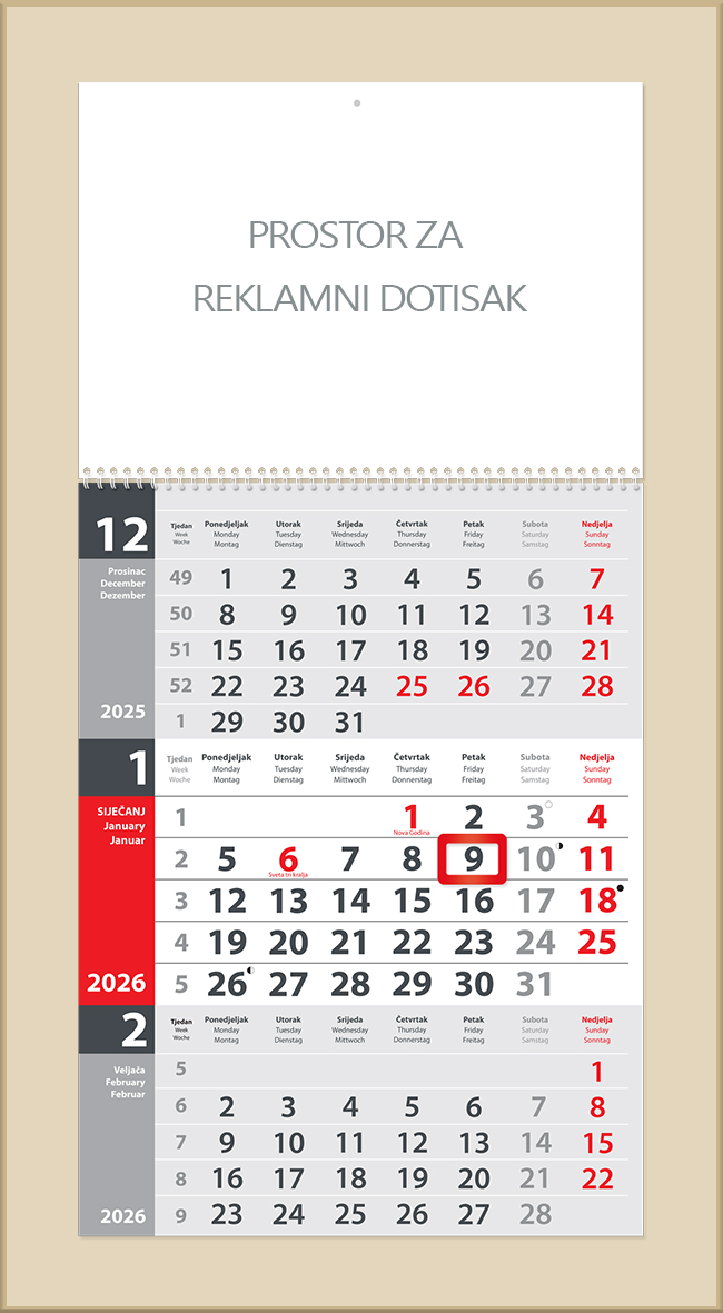 Kalendarij: 3 x 12 listova, uvez spirala, pokazivač datuma jahač
